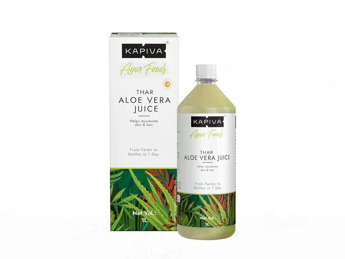 Kapiva Thar Aloe Vera Juice is a 100% Ayurvedic elixir designed to rejuvenate skin and hair for all adults. Sourced from Thar, Rajasthan, this fresh, pulpy, and cold-pressed juice strengthens hair follicles, reduces hair fall, improves skin health, maintains a healthy gut, and supports weight management. Crafted from high-quality aloe vera processed within 4 hours of harvest, it offers a pure, nutrient-rich solution rooted in Ayurvedic traditions for holistic wellness.
