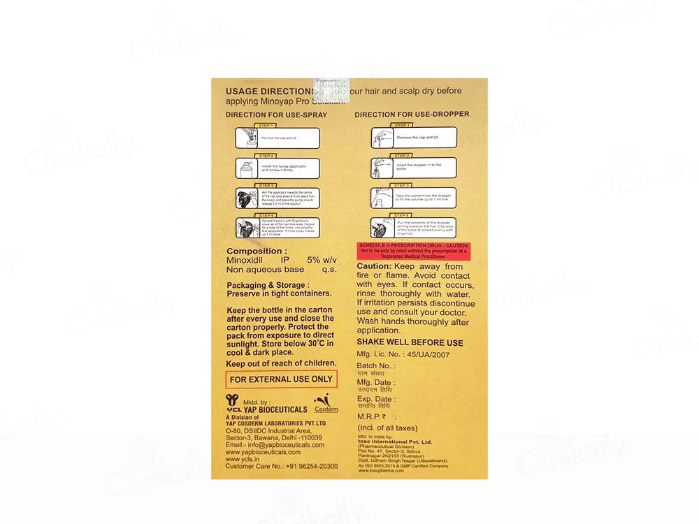 Minoyap Pro Topical Solution is a specialized formulation designed to address hair loss and promote hair regrowth. Enriched with Minoxidil, Procapil & Anagain, it works by improving blood flow to hair follicles, extending the growth phase, and preventing hair thinning caused by hormonal changes. This clinically proven solution revitalizes scalp health, enhances follicle activity, and stimulates thicker, healthier hair growth. Suitable for men with androgenetic alopecia, it should be used under medical supervision for optimal results.