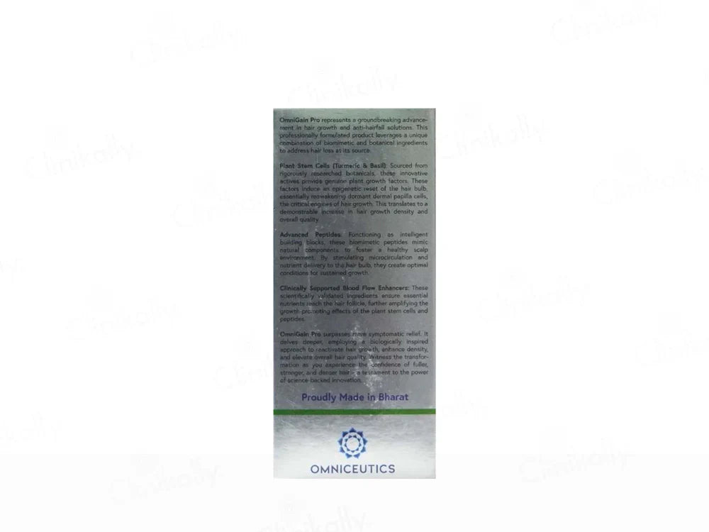 Omnigain Pro Advanced Anti Hairfall & Hair Growth Solution is a potent formula designed to reduce hair fall and promote new hair growth. Infused with scientifically proven ingredients like Redensyl, Anagain, and Procapil, this topical solution targets hair follicles to strengthen them and stimulate hair regrowth. It helps to prevent thinning, reduce breakage, and improve hair density. Suitable for all hair types, this non-greasy, quick-absorbing solution is ideal for daily use to achieve thicker, healthier hair.