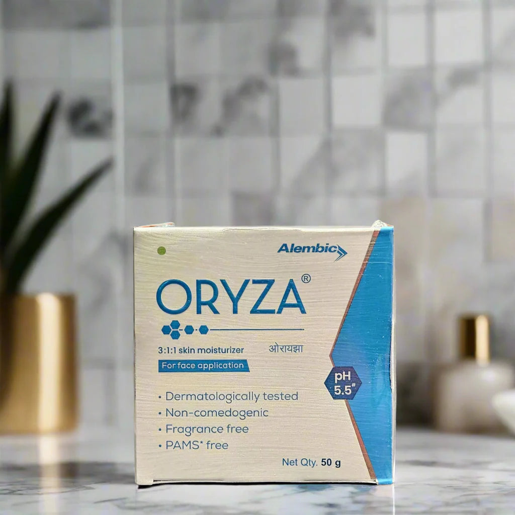 Oryza Skin Moisturiser is a dermatologist-formulated daily moisturizer designed for sensitive and acne-prone skin. With a skin-friendly pH of 5.5 and broad-spectrum SPF 20+, it hydrates while offering essential sun protection. Its non-comedogenic, paraben-free, and fragrance-free formula ensures gentle care without clogging pores or irritation. Enriched with soothing and nourishing actives, Oryza helps restore the skin„¢s moisture barrier. Free from alcohol, soap, and mineral oil, it is ideal for everyday use to achieve soft, balanced, and healthy-looking skin.