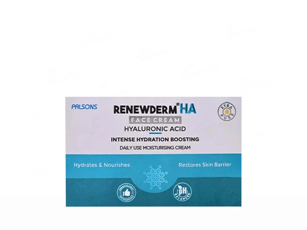 Palsons Renewderm HA Face Cream is a deeply hydrating daily moisturizer formulated with Hyaluronic Acid to deliver intense hydration and skin barrier repair. Ideal for dry, dehydrated, or sensitive skin, this cream nourishes deeply, enhances moisture retention, and restores skin's natural elasticity. With a pH-balanced, dermatologist-tested formula, it promotes a healthy glow while maintaining skin's protective barrier. Lightweight and non-greasy, Renewderm HA Face Cream is perfect for regular use to keep skin soft, plump, and visibly rejuvenated all day long.