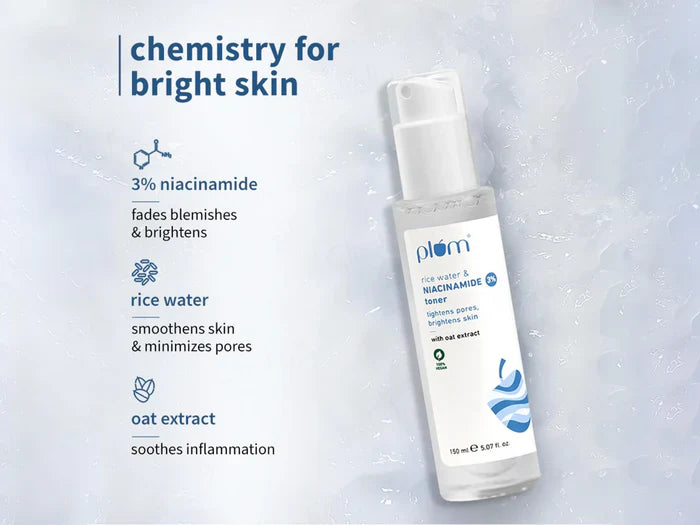 Plum 3% Niacinamide Face Toner With Rice Water & Oat Extract is a pH-balanced, alcohol-free formula designed to brighten and clarify your skin while delivering essential hydration. With 3% niacinamide, rice water, and oat extract, this toner helps fade blemishes, tighten pores, and calm inflammation without drying out the skin. It comes in a fine mist spray format that makes application gentle and refreshing. Ideal for oily, acne-prone, and sensitive skin types, this toner promotes even-toned, smooth skin with every spritz.