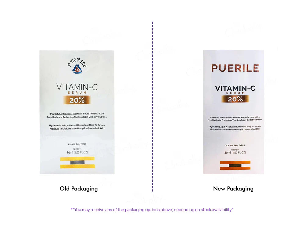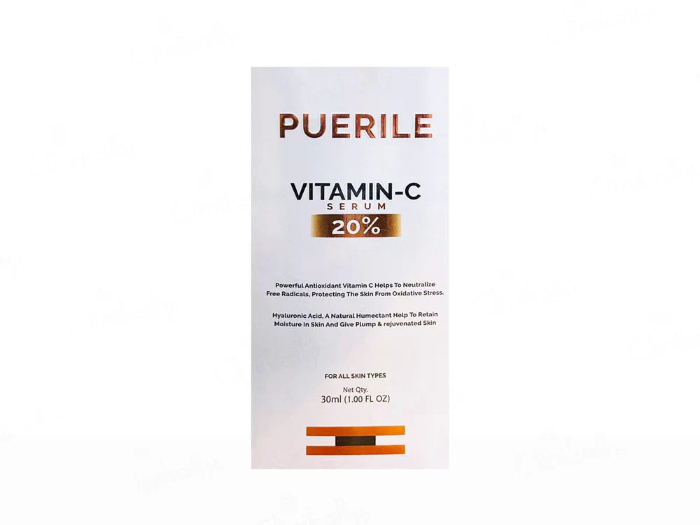 Puerile 20% Vitamin-C Serum is a potent antioxidant-rich formula designed to brighten the complexion, reduce dark spots, and promote a youthful glow. Infused with 20% pure Vitamin C, this serum helps protect the skin from environmental damage, stimulates collagen production, and fades hyperpigmentation. Combined with Hyaluronic Acid and Vitamin E, it deeply hydrates, smoothens fine lines, and enhances skin elasticity, leaving your skin radiant and even-toned. Suitable for all skin types, this serum is perfect for daily use to achieve healthier, glowing skin.