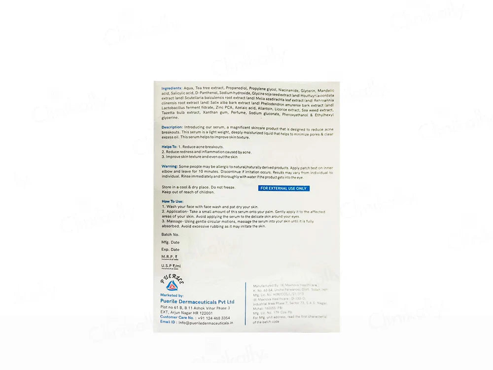 Puerile Acne Serum with Niacinamide is a targeted treatment designed to reduce acne, control excess oil, and improve skin texture. Infused with 10% Niacinamide, this serum helps to minimize the appearance of pores, reduce redness, and calm inflammation associated with acne. Combined with Salicylic Acid and Zinc, it works to unclog pores, reduce breakouts, and balance sebum production. Its lightweight, fast-absorbing formula leaves the skin smooth, clear, and visibly healthier. Suitable for acne-prone and oily skin, Puerile Acne Serum is ideal for daily use to achieve clear, balanced skin.