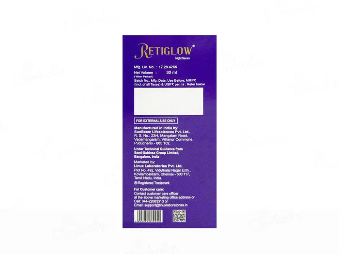 Experience skin rejuvenation with Retiglow Night Serum. Powered by Retinol, it promotes cell renewal, undoing the day's damage from pollution and stress. This serum nourishes, protects, and hydrates your skin, making it an essential step after cleansing and before moisturizing. With key ingredients like Liquorice root and Rice extract, it unclogs pores, reduces fine lines, and leaves your skin smoother and more youthful. Say goodbye to puffiness and wrinkles, and hello to a radiant complexion.