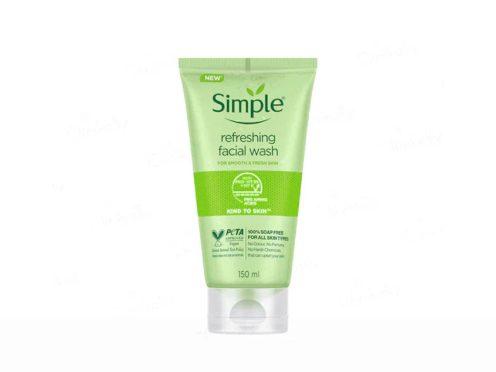 Wet your face with lukewarm water. Apply a small amount of Simple Kind To Skin Refreshing Facial Wash to your hands and lather. Gently massage onto the face in circular motions, avoiding the eye area. Rinse thoroughly with water and pat dry. Use daily, morning and night, for best results.
