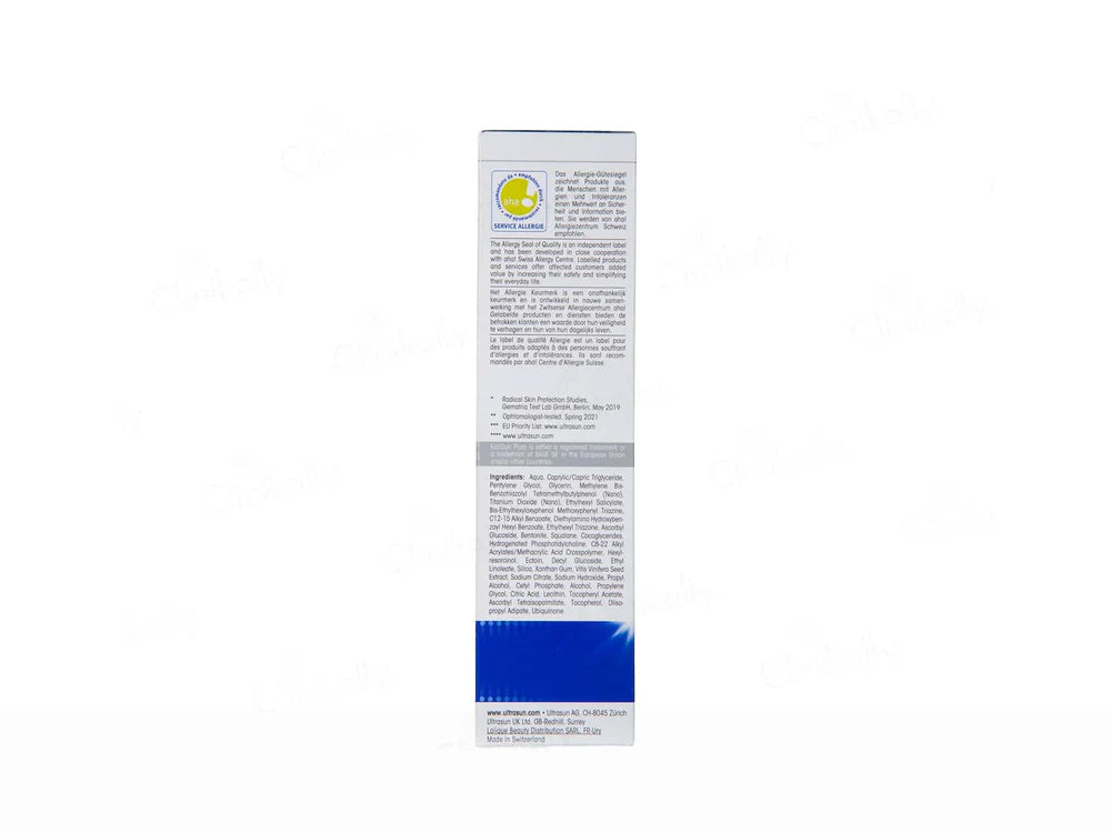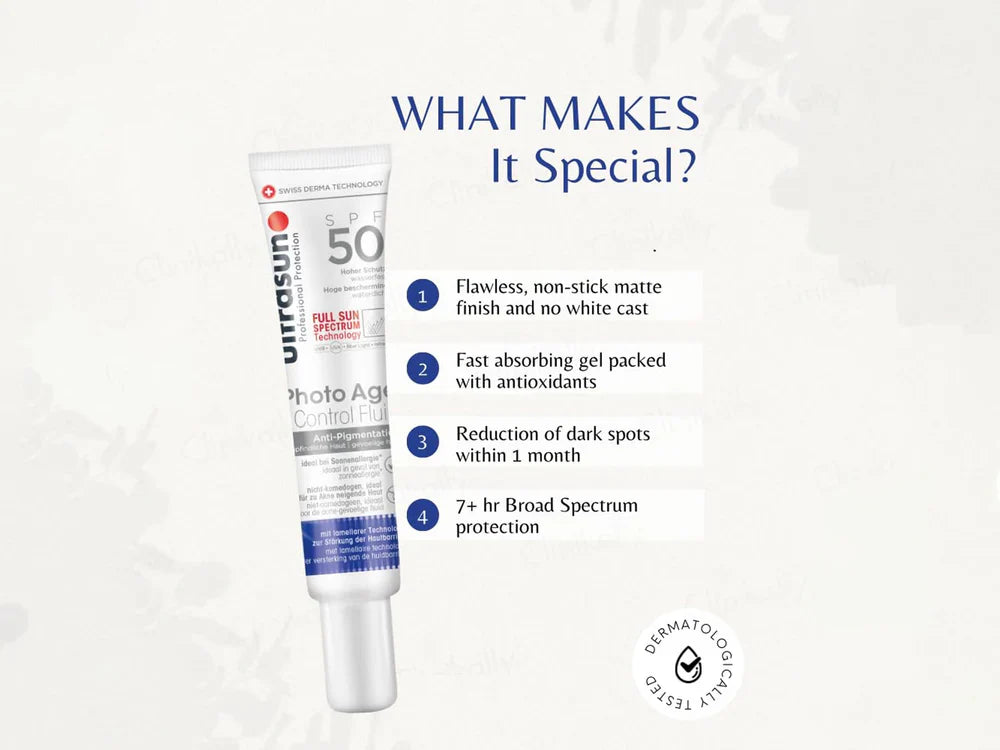 Ultrasun Photo Age Control Fluid Anti-Pigmentation Sunscreen SPF 50 PA++++ provides advanced sun protection while targeting pigmentation and signs of aging. This lightweight fluid formula offers broad-spectrum UVA and UVB protection, helping to prevent sun-induced pigmentation and dark spots. Enriched with anti-aging ingredients, this fluid sunscreen promotes a smoother and more even skin tone. Ideal for daily use, it absorbs quickly and leaves a matte finish, suitable for all skin types.