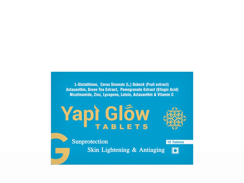 Yapi Glow Skin Lightening & Antiaging Sunprotection Tablet is a powerful nutraceutical supplement designed to brighten the skin from within, reduce pigmentation, and offer antioxidant protection. Enriched with L-glutathione, grape seed extract, vitamin C, and other potent antioxidants, it supports healthy skin, reduces oxidative stress, and helps delay signs of aging while offering internal sun protection benefits.