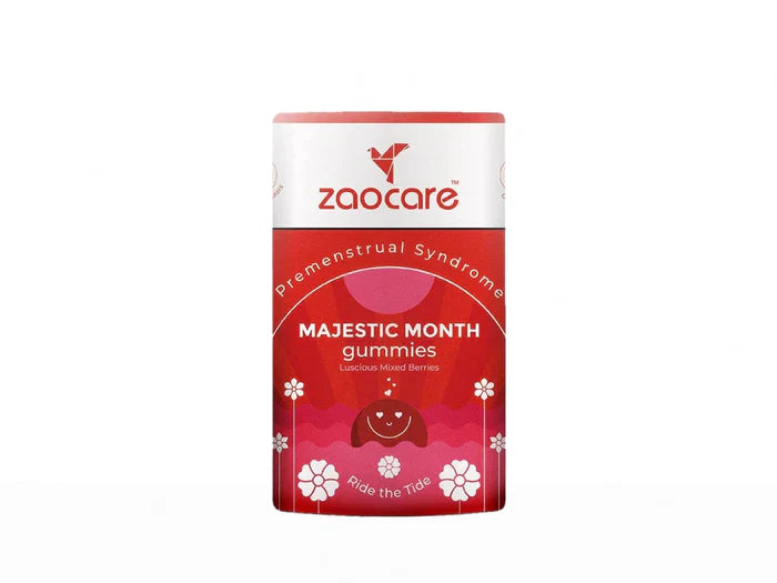 Zaocare Majestic Month Premenstrual Syndrome Gummies - Luscious Mixed Berries Flavour are specially formulated to provide relief from premenstrual syndrome (PMS) symptoms. These gummies combine natural ingredients like Vitex Agnus, Lemon Balm, Angelica Root Extract, and Black Cohosh with essential nutrients such as Magnesium and Vitamin D3 to help balance hormones, reduce cramps, and improve mood. The luscious mixed berries flavor makes taking your daily supplement a delightful experience.